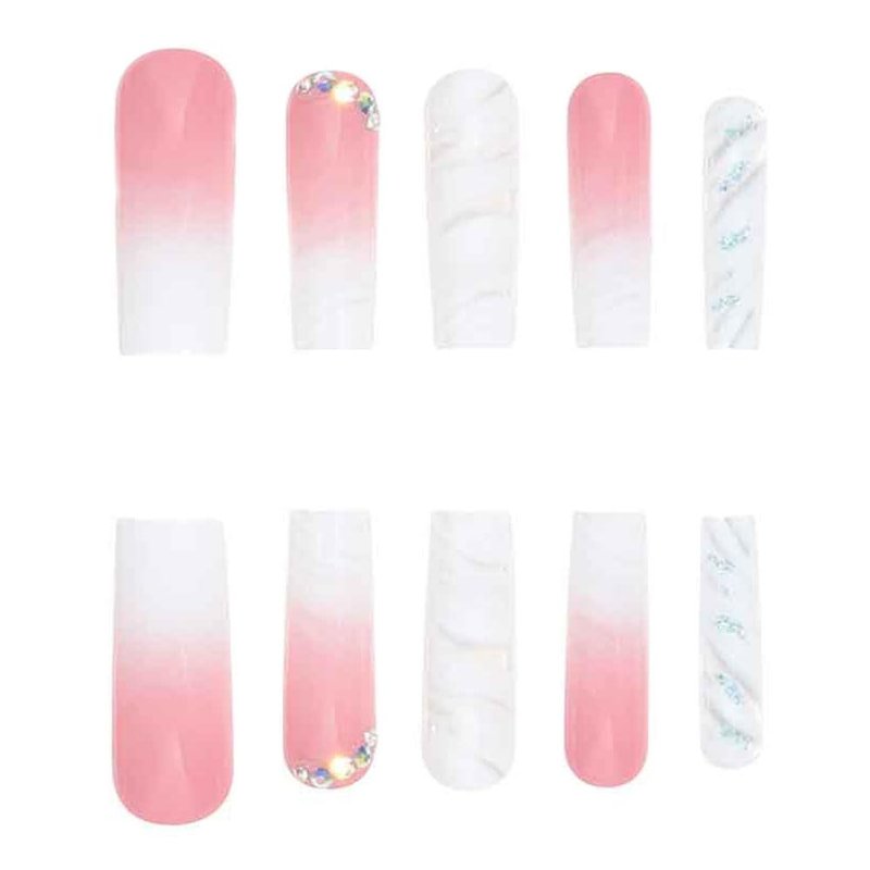 Ombre Pink White Press on Nails Long Square BAOYAALIN, Glitter Fake Nails with Rhinestones Design Gel Glue on Nails for Women Girls Full Cover Acrylic Artificial False Stick on Nail for Wedding 24Pcs