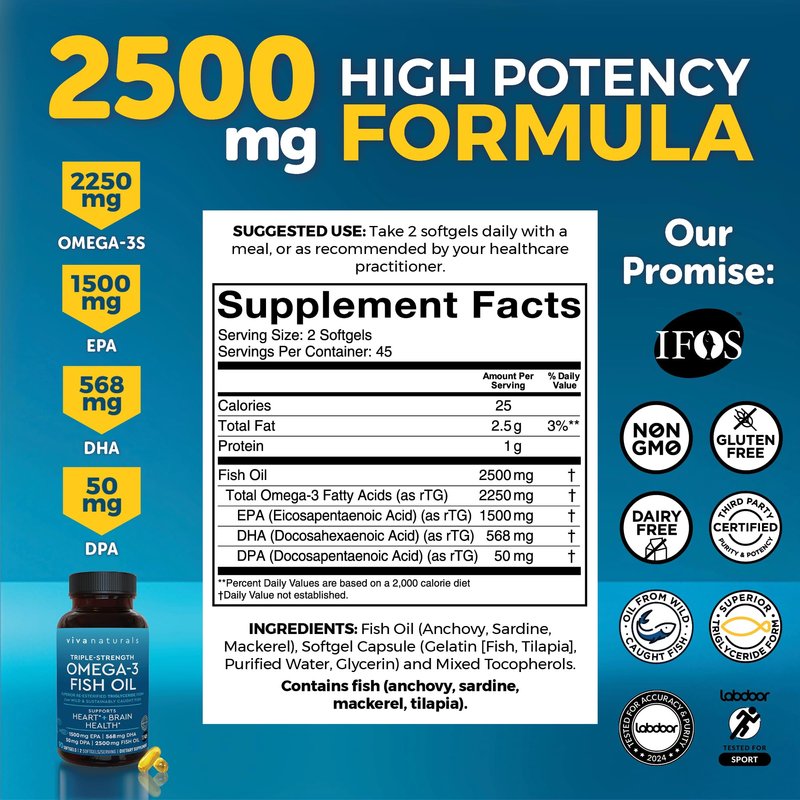 - ✔️ TRIPLE STRENGTH OMEGA-3 FISH OIL - Our fish oil for men and women delivers 3X the omega-3s compared to what you get with some other fish oil supplements. Each serving provides 2,500 mg of fish oil, including 1,500 mg EPA, 568 mg DHA and 50 mg DPA