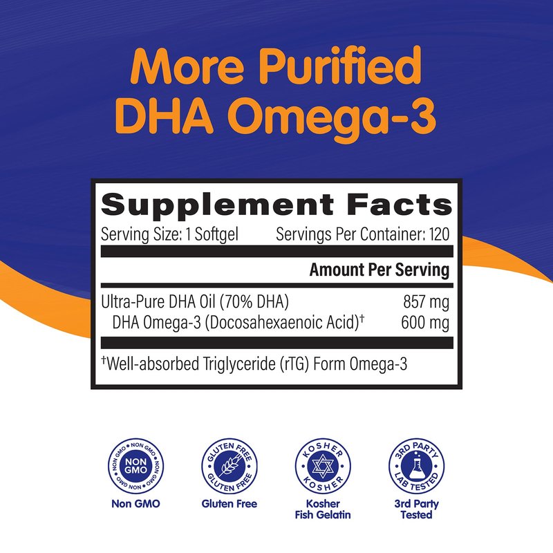 OmegaVia DHA 600 mg - Ultra Pure Omega-3 DHA Supplements for Brain & Eyes, Pregnancy & Prenatal DHA Vitamins for Women, Burpless Fish Oil Omega 3 Supplement, IFOS 5-Star Certified - 120 Softgels