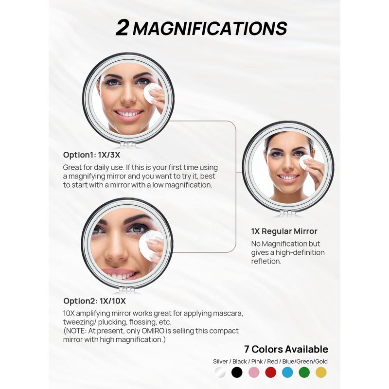 - 1X & 10X MAGNIFICATION: A two-sided mirror suitable for cosmetic use. The main mirror perfectly reflects a clear image of the entire face while the other side is 10x magnified and is great for applying mascara, tweezing, plucking, flossing, etc.