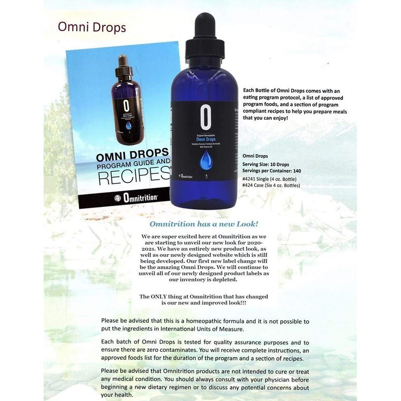 A comprehensive program, which is ACCOMPANIED BY THE OMNI DROPS. Comes with an eating plan guide and recipes INCLUDES: 4-ounce Bottle of Omni Drops with Dropper and Program Guide. Please be advised that this is a homeopathic formula and it is not possible to put the ingredients in International Units of Measure. Each batch of Omni Drops is tested for quality assurance purposes and to ensure there are zero contaminates. You will receive complete instructions, an approved foods list for the duration of the program, and a section of recipes. Omnitrition products are not intended to cure or treat any medical condition. You should always consult with your physician before beginning a new dietary regimen or to discuss any potential concerns about your health. Seasonal Packaging in which Drops and Dropper are separate within a foil package may be prone to some condensation within the Foil Envelope, rest assured that as long as the safety seal is intact the bottle is not leaking.