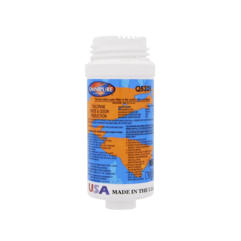 OMNIPURE-Q5328 Features: -Twist in design for use with threaded permanent head systems. -GAC filtration media to reduce chlorine taste and odor. -5 Micrcon filter. -0.5 GPM flow rate. -Made in the USA. Product Type: -Reverse-osmosis. Filter Component: -Replacement filter. Country of Manufacture: -United States. Dimensions: Overall Height - Top to Bottom: -6.5". Overall Width - Side to Side: -2.63". Overall Depth - Front to Back: -2.63". Overall Product Weight: -0.65 lbs. Specifications: NSF Certified: -Yes.