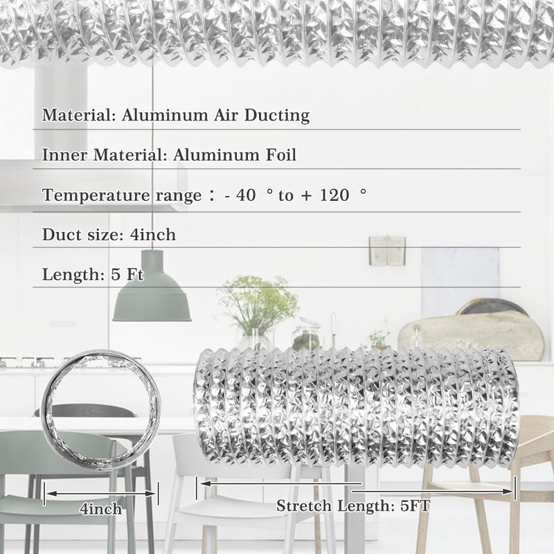 Omont Dryer Vent Hose 4 Inch 5FT Flexible Dryer Ducting Tube Air Duct Aluminum Insulated Flex Hose Kit Indoor Outdoor