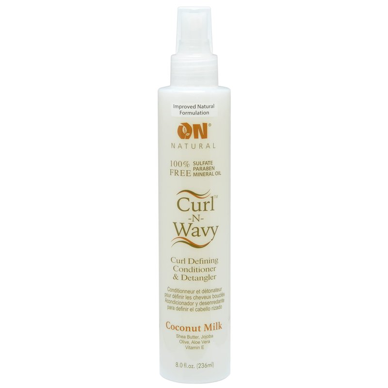 ON NATURAL Curl-N-Wavy Curl Defining Conditioner & Detangler is made with superior quality ingredients. Excellent for all types of chemically processed and natural curly & wavy hairs with defining "S" pattern of the curl. The improved formula helps to restore moisture and to soften dry, frizzy, damaged hair. COCONUT MILK Direction: For excellent conditioning and detangling, hold the bottle 6-10 inches from clean hair and spray throughout. Use a finger or brush for even distribution. Do not rinse. Style as desired. Ingredients: Water (Aqua), Glycerin, Panthenol, Hydrolyzed Wheat Protein, Aloe Barbadensis Leaf Juice, Stearalkonlum Chloride, Cetearyl Alcohol, Cocos Nucifera (Coconut) Oil, Argania Spinosa Kernel Oil, Olea Europaea (Olive) Fruit Oil, Simmondsia Chinensis (Jojoba) Seed Oil, Butyrospermum Parkii (Shea Butter), Tocopherol (Vitamin E), PEG-40 Hydrogenated Castor Oil, Propylene Glycol, DMDM Hydantoin, Fragrance (Parfum), Citric Acid Caution: For external use only. Keep away from children. Contact a physician in case of emergency.