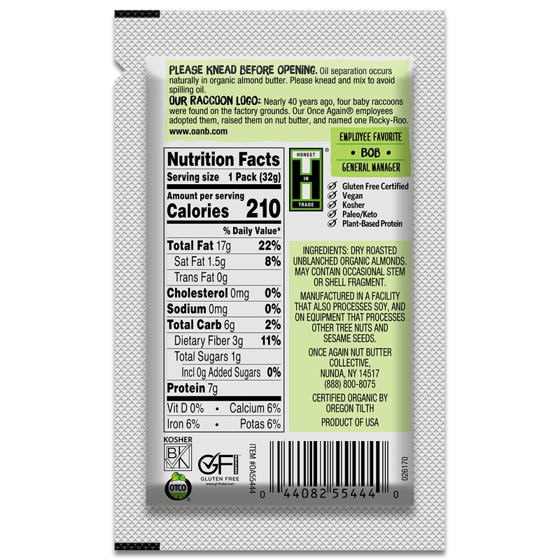 - CREAMY ALMOND BUTTER || Pack of ten squeeze packs of deliciously creamy almond butter. Our almond butter is made with carefully selected, organically grown, unblanched almonds that are dry roasted and milled until they are wonderfully creamy. Made in a peanut-free facility. Manufactured in a facility that also processes soy, sesame seeds, and on equipment that processes other tree nuts