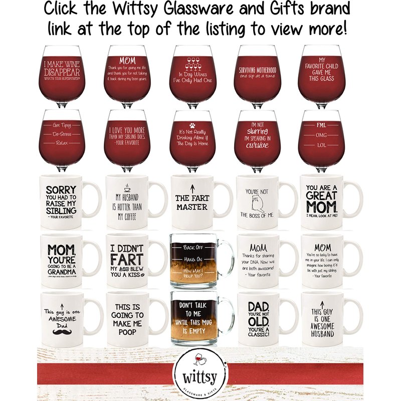 - SATISFACTION GUARANTEE - All of our gift items are backed by our manufacturer's money back guarantee ensuring you receive a quality product free from defects; Wittsy Glassware creates unique novelty drinkware with sayings that make fun gifts for him or her, parents, children, mom, dad, son, daughter, husband, wife, brother, sister, grandma, grandpa, uncle, boys, girls, seniors, adults, teens, kids, man, male, female