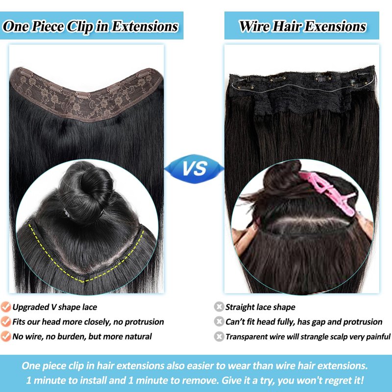 Innovative one piece clip in hair extensions is the easiest way to add hair volume, there is only one piece hair weft with 5 clips, even you are a hair extensions beginner, you could get a full hair within 1 minute! Compare with 7pcs/5pcs clip hair extensions or wire hair extensions, 1 piece hair extensions is less burden to your scalp, but the same wearing effect. Highly recommend to have a try, you will love it!