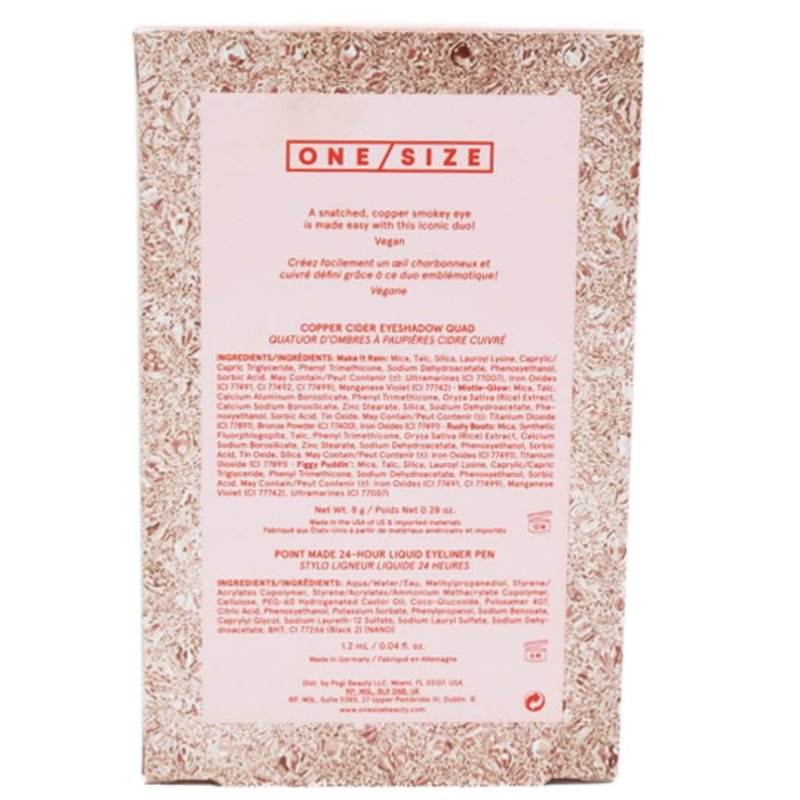 ONE/SIZE by Patrick Starrr Point Made Eyeliner & Eyeshadow Set Color: Copper Cider -- A versatile smokey eye duo featuring a limited-edition eyeshadow quad and iconic Point Made Waterproof Liquid Eyeliner Pen.The Set Includes: (1) Point Made 24HR Liquid Eyeliner Pen in Bodacious Black. (2) Copper Cider Eyeshadow Quad with shades Make It Rein (Light Rusty Brown Matte), Mistle Glow (Gold Shimmer), Rusty Boots (Copper Foil), Figgy Puddin' (Warm Brown Matte) How to Use:Using your fingertip or dense brush press apply foil shade all over the lid and blend out. Create a dimension with the lightest matte by sweeping shadow into the crease of the eye and along the top and bottom lash lines. To intensify, use the darkest matte shade on the outer corner of the eye and blend inward. With Point Made Liquid Liner use fluid, light strokes at the inner corner of the lash line to draw a line working toward the outer corner of the eye. Finish by applying the lightest shimmer shade to the inner corner of the eye and under brow bone using a damp brush or fingertip for maximum payoff.