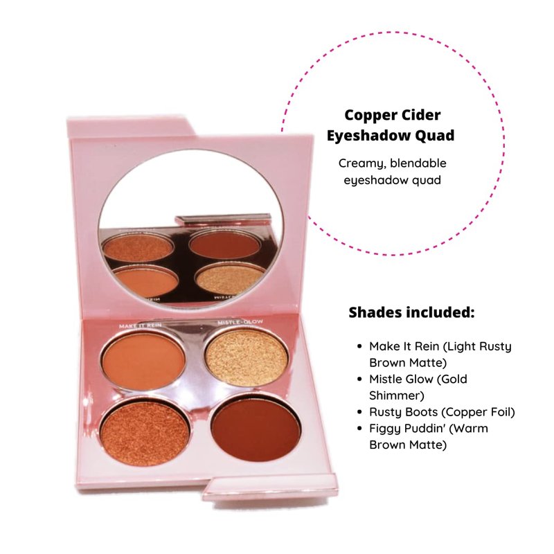 - Eyeshadow Quad: The eyeshadow palette contains four shimmery shades in a copper color for a beautiful eye look.