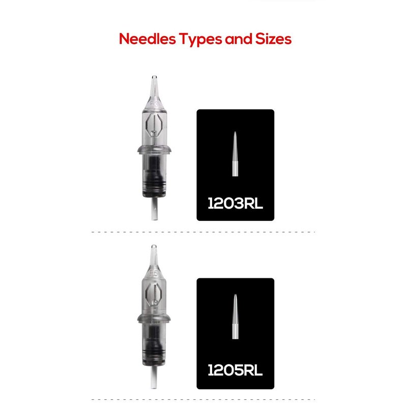 One Tattoo World 50-Pack Assorted size (10pcs each of 3RL, 5RL, 7RL, 9RL, 11RL) Premium Quality Disposable Tattoo Cartridge Needle for Rotary Pen Tattoo Machine, OTW-50-PN2 Needle Diameter : #12 (0.35mm); compatible with all standard cartridge grips & machines. Safety membrane inside cartridges system stops ink from passing through to the Tube and Machine, Clear tip get better visibility tattooing , Ethylene Oxide Gas Sterilized and Individually Packaged, single use only, Made of 316L surgical stainless steel and medical-grade plastic