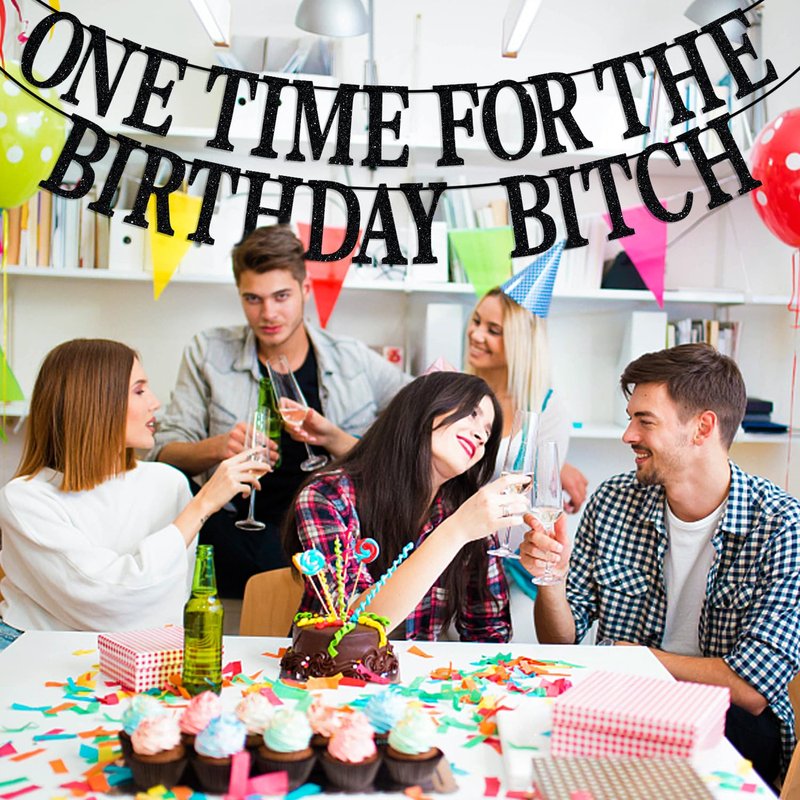 One Time for The Birthday Bitch Banner-Happy Birthday Bunting Backdrops-Funny Birthday Sign for Adult Birthday Party Decorations Supplies, Black Glitter