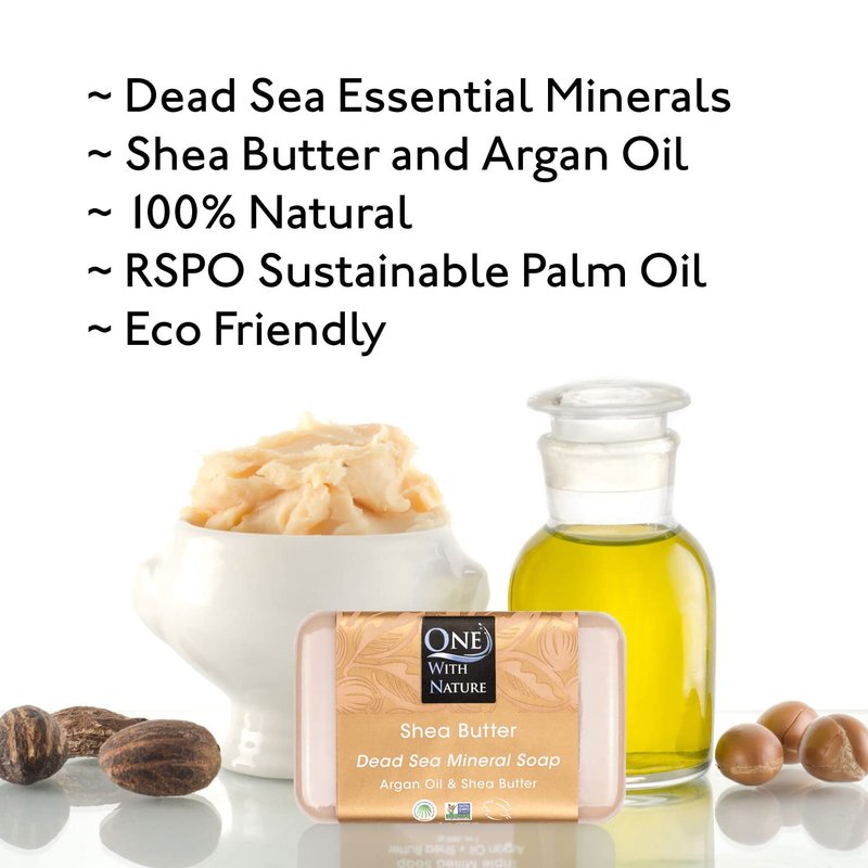 - SUITABLE FOR ALL SKIN TYPES: One With Nature Dead Sea mineral shea soap is suitable for all skin types for men, women and children. This shea butter soap bars hydrates, cleanses, and nourishes, leaving your skin soft and balanced. Infused with Argan Oil and Shea Butter. This extra-mild, vegan soap offers a gentle cleansing while preserving the natural balance of the skin.