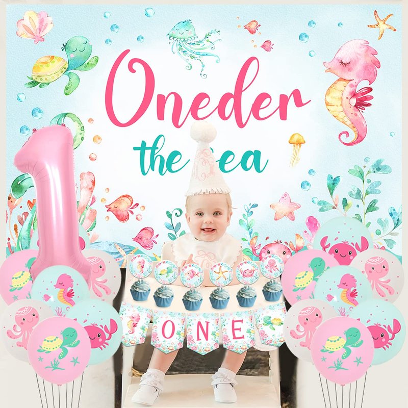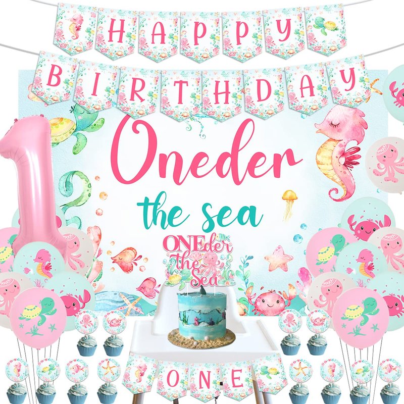 Oneder the Sea 1st Birthday Girl Decorations, Under the Sea Ocean Animal Birthday Party Supplies, Oneder the Sea Backdrop Happy Birthday Banner High Chair Banner Cupcake Cake Topper Printed Balloons