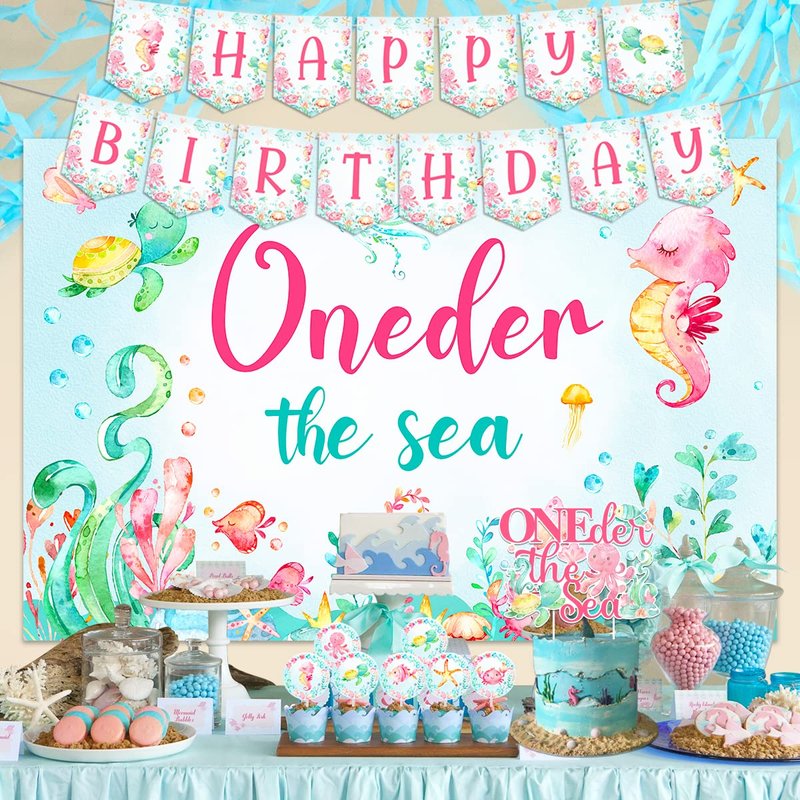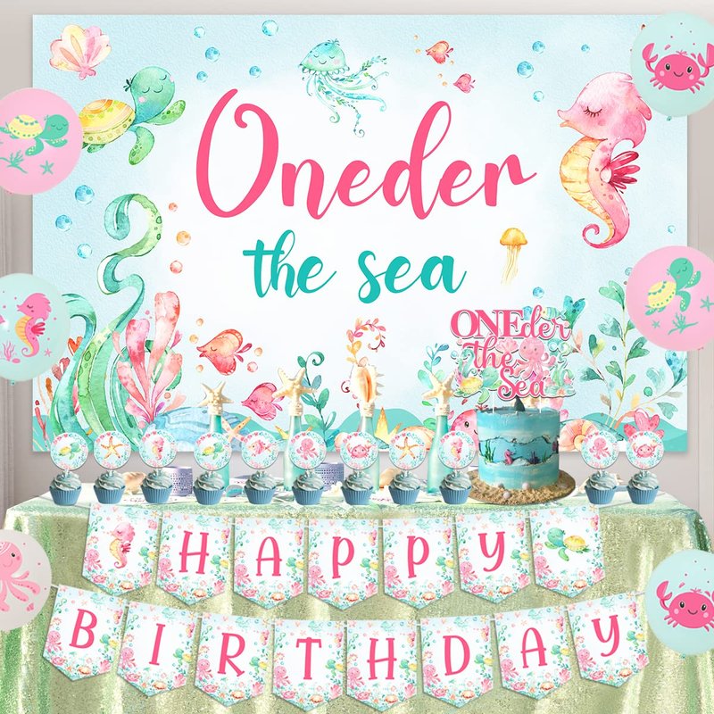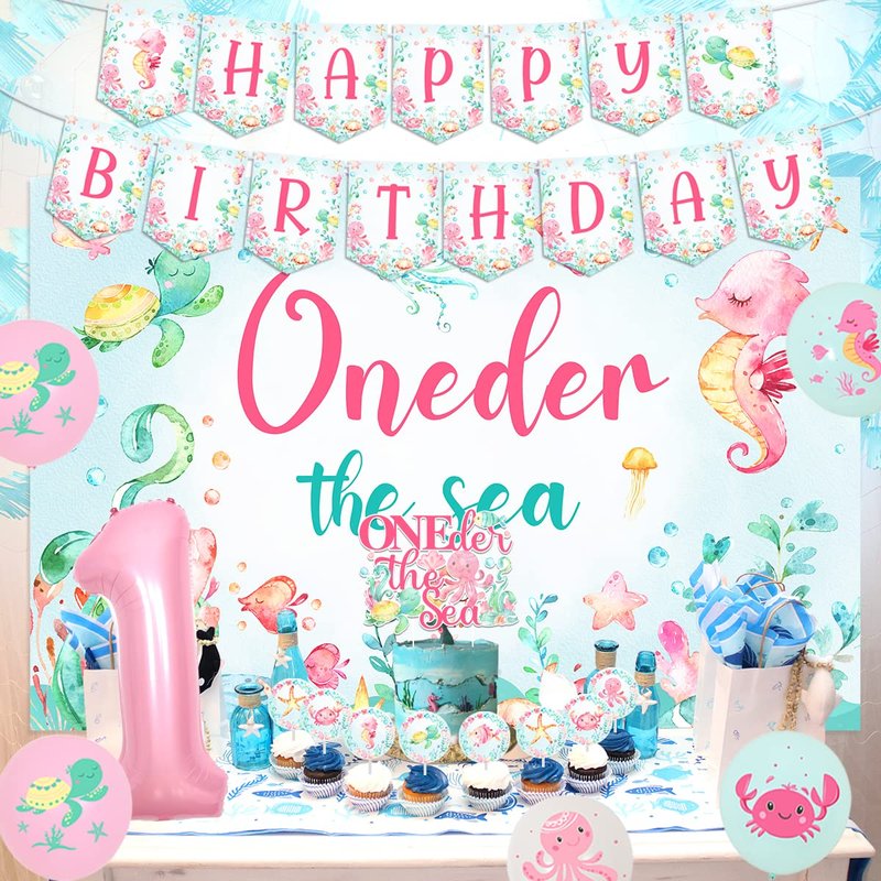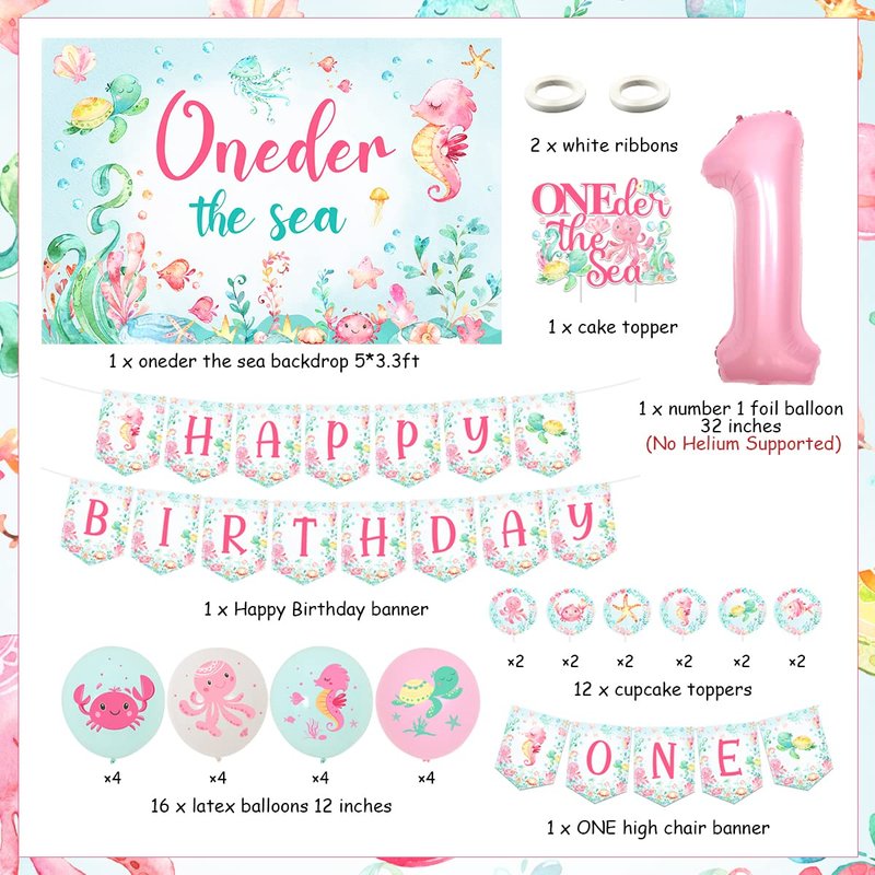 - Package Content: The package includes 1pc happy birthday banner, 12pcs double-sided cupcake toppers, 1pc oneder the sea cake topper, 1pc one high chair banner, 16pcs ocean animal printed balloons, 1pc number 1 foil balloon 32 inches, 1pc oneder the sea backdrop 5*3.3 ft, and 2pcs ribbons.