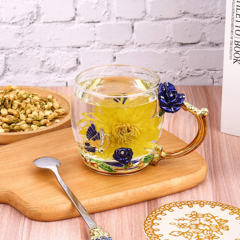 - Beautiful Elegant Mug:Our enamel glass tea cup is handmade and has an elegant style with butterfly and rose flower 3D designs,glass material of cup is glittering and clear. Never fade as time passed.