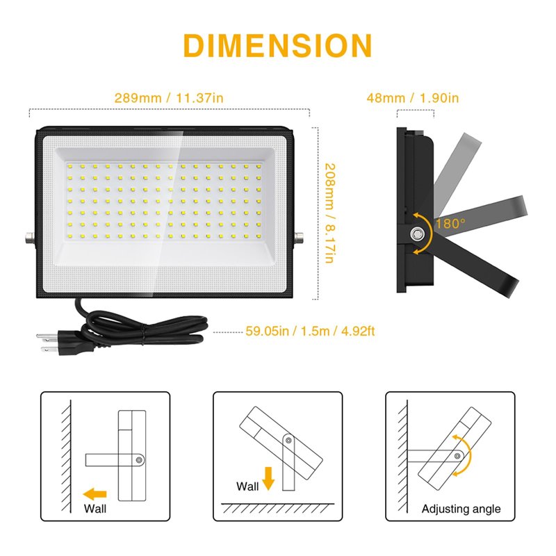 - [100W Ultra Bright Flood Light] LED flood light with 112 super bright LEDs, producing up to 8900lm pure daylight white light. Ideal for yards, garages, and other buildings, providing security in the dark. With advanced high-efficiency LEDs, these outdoor flood lights save 80%-90% on electricity. No Dusk to Dawn, Motion Sensor, Switch, or Remote Control included.