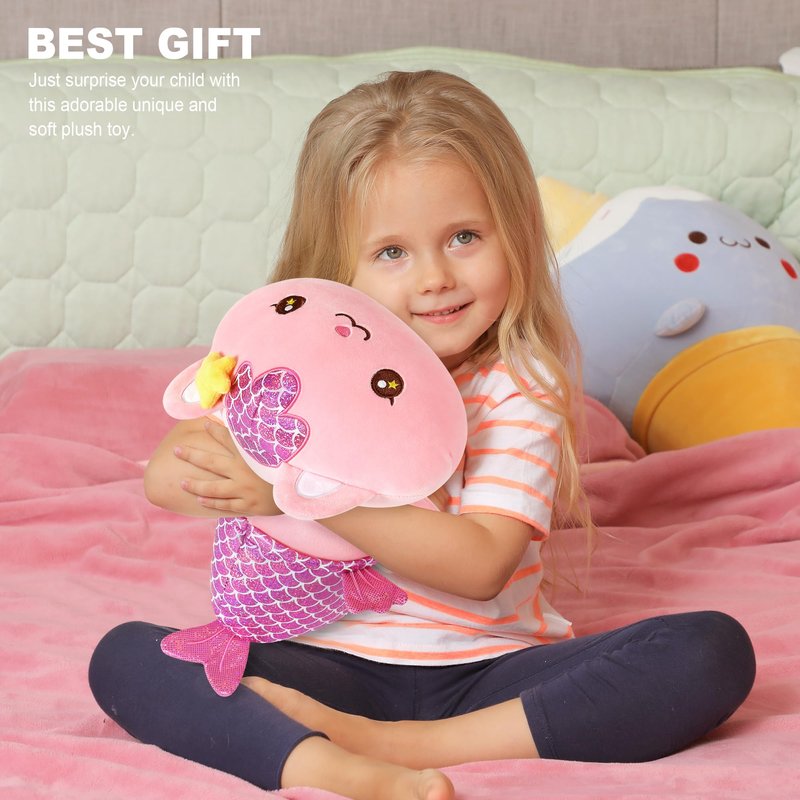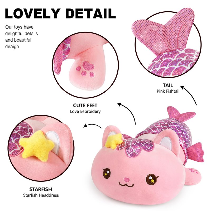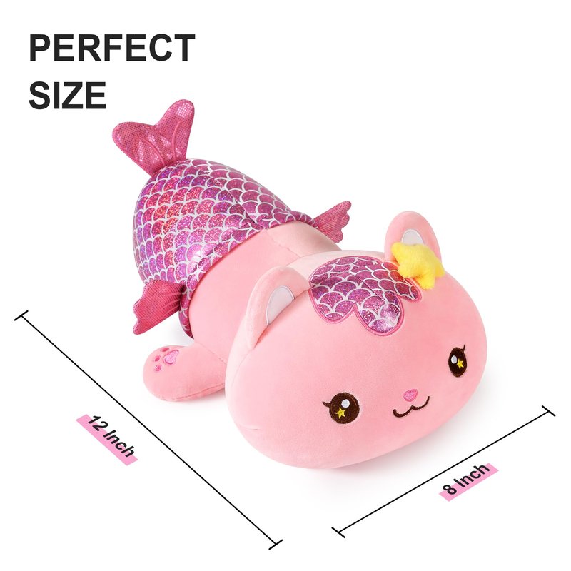 - [Unique Gift] This mermaid cat plushie kitty pillow is suitable for children, family members, friends, and relatives, making it a versatile gift option. Both adults and kids will enjoy hugging this cat stuffed pillow, making it a great addition to bedrooms, living rooms, family spaces, offices, and more.