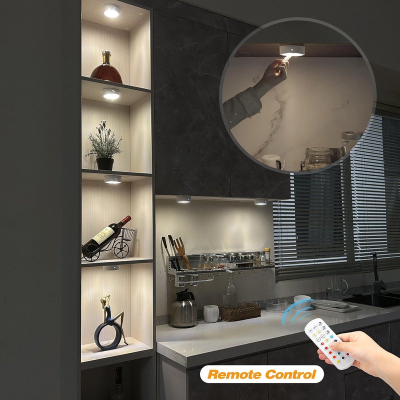 - ▶Remote Control Lights: Comes with 2 handy remotes, easily control battery puck lights even in hard-to-reach places. Use the remote to customize your favorite light color among 15 static light colors and 3 dynamic light modes, quick dim the brightness level from 10 to 100%.