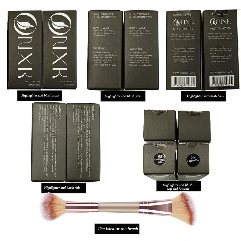 - [Multifunctional suit]1 pcs highlighter stick & 1pcs bronzer stick & 5 pcs soft brush makeup kit. It can be used alone or superimposed use. A single tube achieves simple highlights, and superimposed two colors match the naturalness of your skin tone with a shimmering beauty.The double-ended makeup brush realizes highlighting and contouring at the same time.