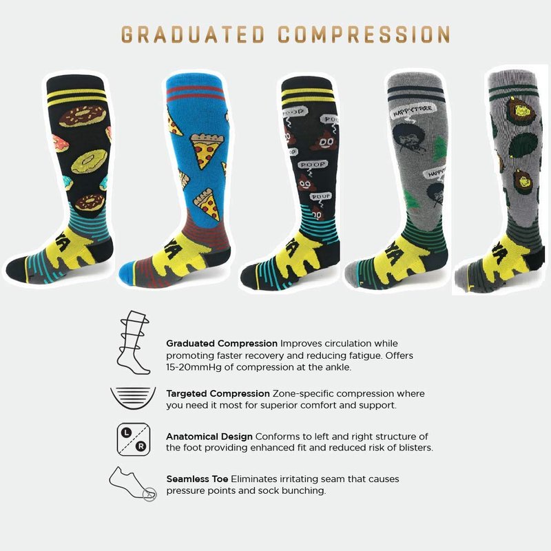 Our novelty fun unisex compression socks is the perfect blend of style, comfort, and humor. These socks feature delightful pizza, donuts, avocado, beer, emoji poop and etc. patterens, for a playful twist. Crafted with professional compression technology, they provide 15-20 mmHg pressure for better blood circulation, reduced fatigue, and swelling. Made with premium materials, these socks are durable and comfortable for everyday wear or sports. They make a unique and fun gift for your loved ones.