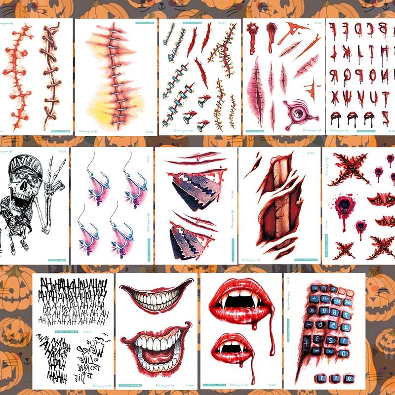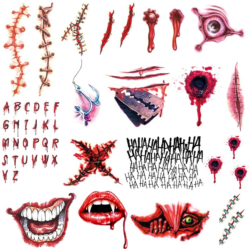 - 👻BEST HALLOWEEN GIFT for YOU (Horror Wounds Bloody Scar Halloween Tattoos for the Whole Party)-- Each sheet measures 5.9X4.1" creating the perfect size tattoos! 14 Large sheet with individually wrapped to be easily included in a party gift bag. Perfect body makeup tattoos for Halloween party and cosplay party!