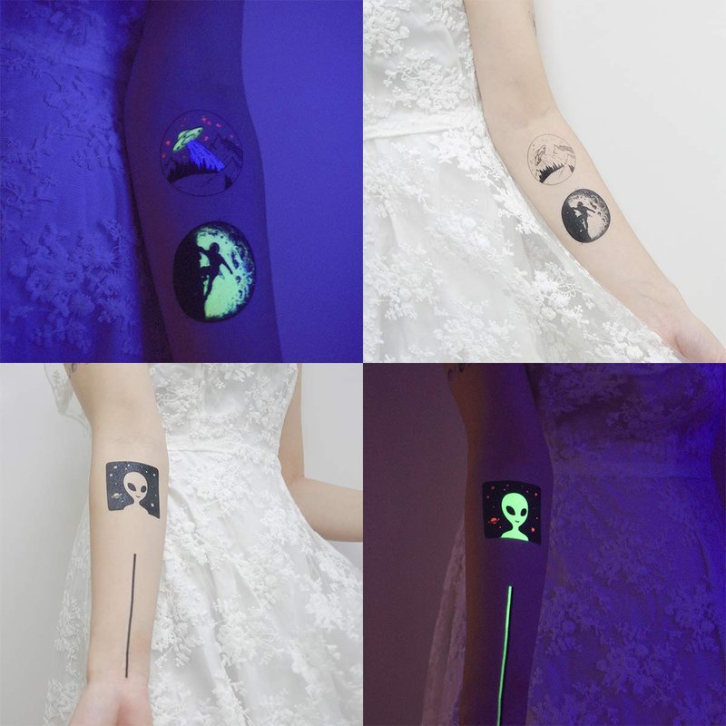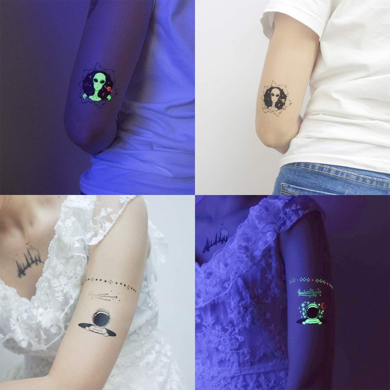 Oottati 15 Sheets Temporary Tattoo Stickers Glow in Dark Children Night Luminous Fluorescent Green Light Rainbow Rocket Alien Planet Astronaut Milky Way