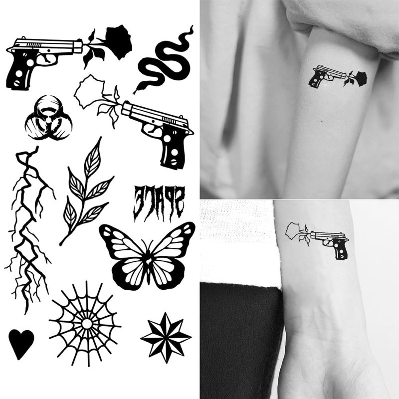 Oottati 2 Sheets Small Tiny Temporary Tattoo Stickers Old School Gun Rose Butterfly Spider Net Snake Heart