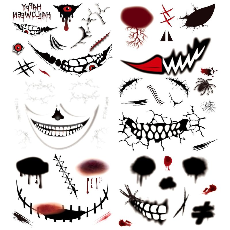 Oottati 6 pcs Scary Face Make Up Halloween Realistic Temporary Tattoo Stickers Horror Prank Props Decals Cosplay Party Zombie Sewing Scar Blood Wound For Men Women