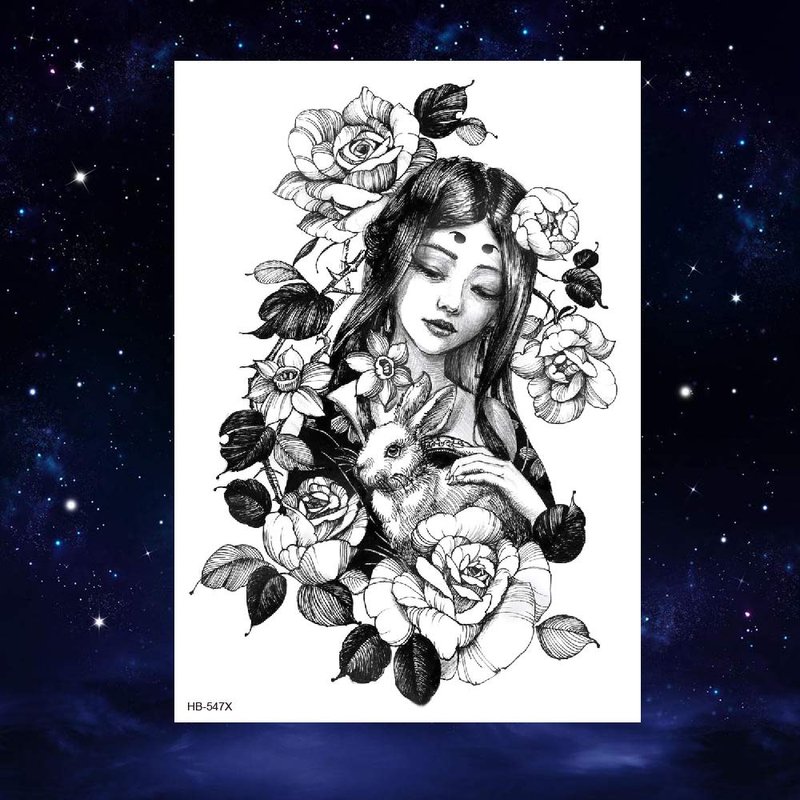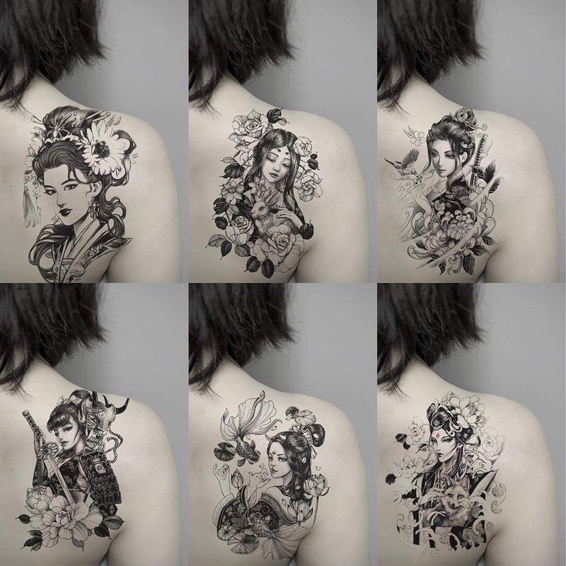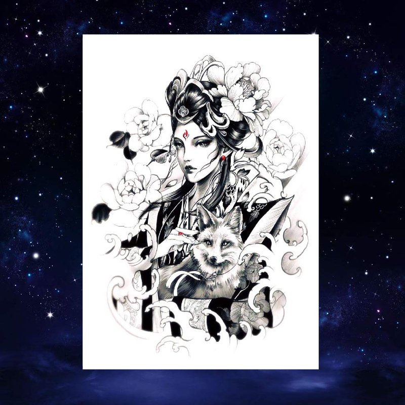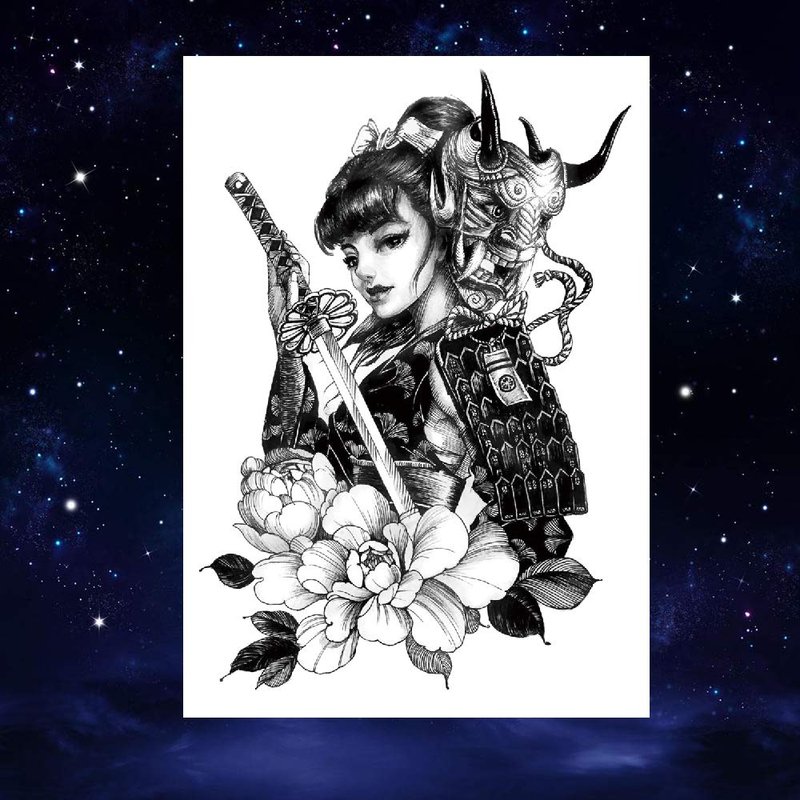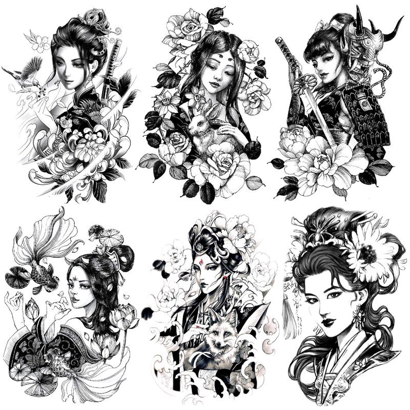 Oottati 6 Sheets Black Japan Warrior Samurai Goldfish Geisha Bird Lotus Prajna Rabbit Temporary Tattoos
