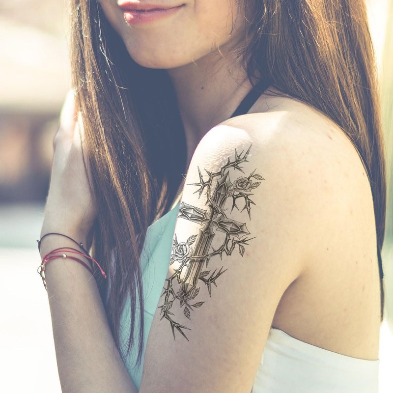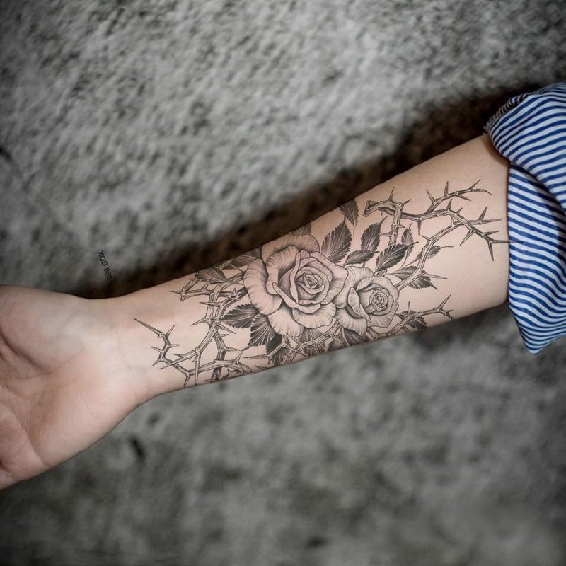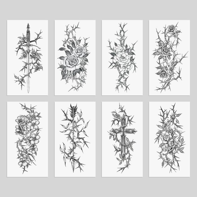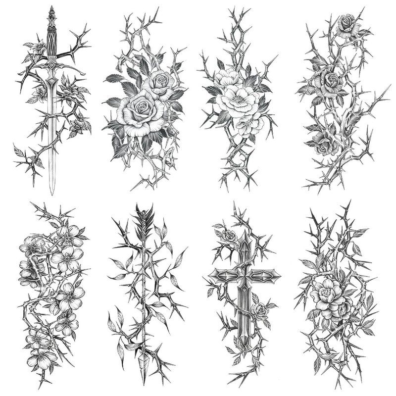 Oottati 8 Sheets Arm Waterproof Temporary Tattoos Black Sword Thorns Flower Rose Cross
