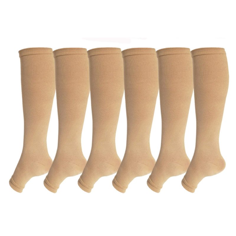 - OPEN TOE COMPRESSION SOCKS - SKUNDU knee high compression open toe socks are made of premium quality material, lightweight, breathable & durable, sweat-absorbent, anti-slip. we are able to create a high-quality compression sock in a great value. The socks deliver 15-20 mmgh compression and it will not irritate your skin, they are the best choice for women and men.