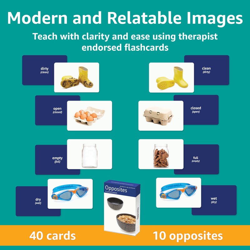 - HIGH QUALITY FLASHCARDS: Featuring 10 pairs of opposites flash cards such as empty/full and dirty/clean. Printed on high quality, thick card stock that has a smudge proof and water resistant coating.