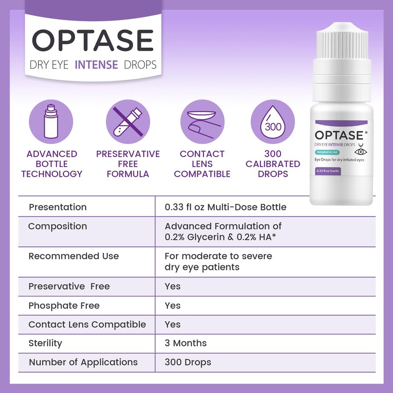 - PRESERVATIVE FREE: Optase Intense Eye Drops is the only product of its kind to provide a preservative free combination of ingredients designed to treat dry eye patients in a unique multi-dose bottle