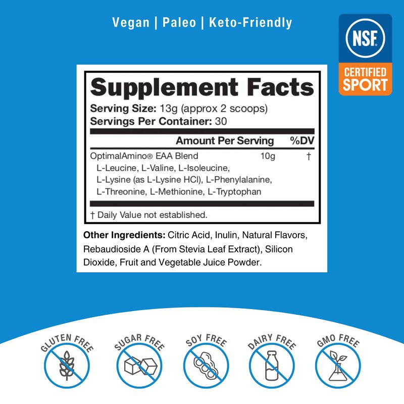 OptimalAmino is a breakthrough EAA protein replacement that was clinically formulated to provide 99% utilization in repairing and building human body protein. OptimalAmino is rigorously third-party tested - well beyond industry standards - and our OptimalAmino Passion Mango Powder has earned the premier NSF International Certified for Sport certification. OptimalAmino is the perfect replacement for animal and plant-based dietary protein and protein powders.