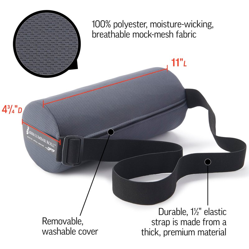For over 25 years, the OPTP Original McKenzie Lumbar Roll supports have helped hundreds of thousands achieve freedom from common low back pain. These lumbar rolls are the top-selling lumbar cushions, and the recommended choice of physical therapists, chiropractors, and back pain professionals around the world. Their durable, high-quality construction is unparalleled; they feature a non-wrinkle, moisture-wicking, 100% polyester removable cover. Despite many imitators on the market, the Original McKenzie Lumbar Roll remains the only lumbar support approved for use with the McKenzie Method and the “Treat Your Own” series of self-help exercise books written by the late Robin McKenzie, perhaps the single most influential person in orthopedic physical therapy. These lower back sciatica pain relief pillow supports are ideal in the car, at the office, or for use with any seat that does not provide adequate lumbar support. Whether used as a back support for office chair comfort, kitchen chair back support, or as a lumbar support pillow for car rides, they help ensure proper spine alignment and posture while sitting on your butt, providing comfortable back pain relief for the lumbar (low back) region. The built-in strap secures the lumbar roll to most chair backs and can even be used around the waist. Choose from standard density or firm density for added lower back support. Rolls measure approximately 11" L x 4.75" diameter. Strap contains latex. Made in the USA.