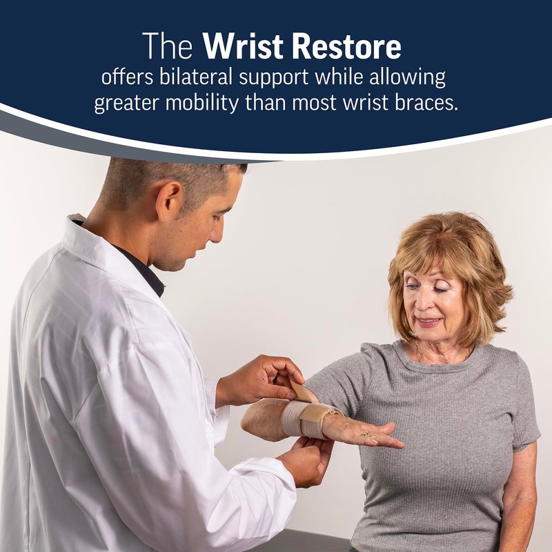 The patented Wrist Restore, designed by the IAOM-US, features a uniquely molded support that, together with the bilateral compressive force of the two proximal straps, establishes control of scaphoid-lunate and triquetro-lunate joint complexes.