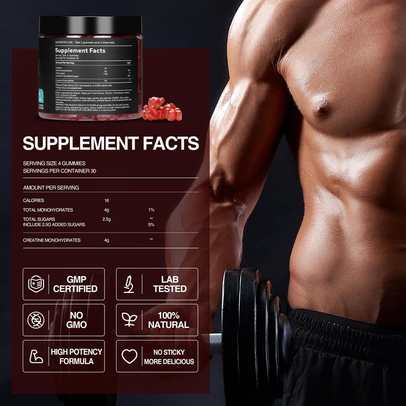 - [Premium Formula,Maximum Efficacy]:Our Creatine Monohydrate are easy to consume, with just 4g= 4 gummies per serving. They enhance muscle strength, Improve sports performance, improve endurance, and boost energy.