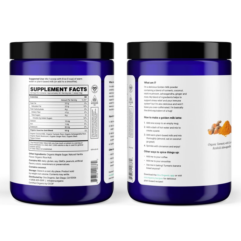 - Highest Quality Ingredients: Ora's Golden Milk is a full container of USDA organic, non-GMO, vegan, gluten-free, soy-free, non-artificial golden goodness.