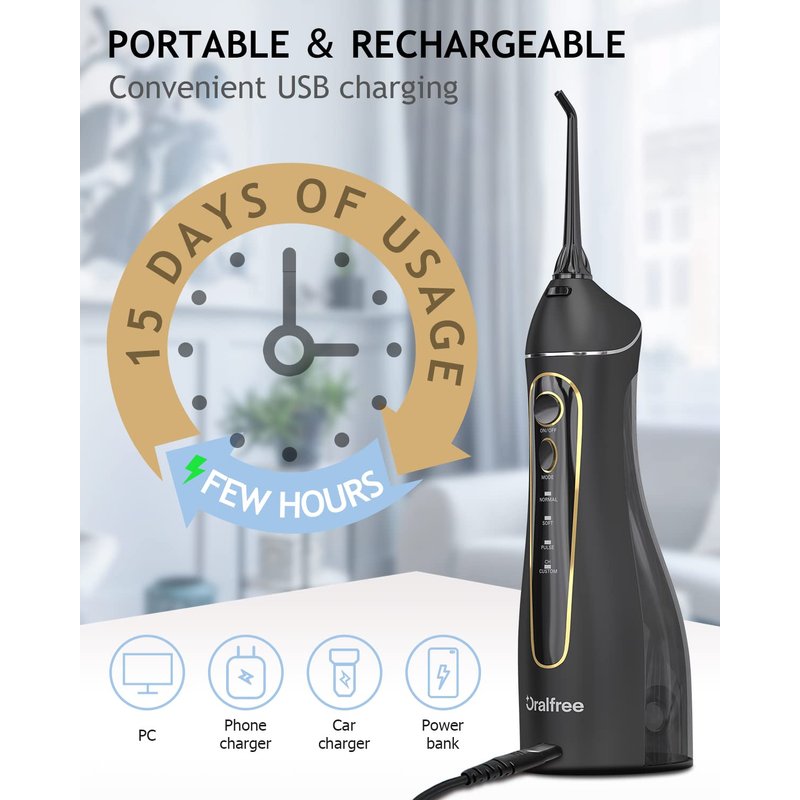 - Powerful Battery &T IPX7 Waterproof : Water dental piks With powerful and environmental battery, fully charged need 4 hours and used continuously for about 15 days. Come with USB Cable,(Adapter Not Included), applicable to a variety of charging equipements such as power bank, computer, laptop... With double-sealing rings, oral irrigator prevent water leakage reliably, can use for shower in the bathroom and it's washable to clean
