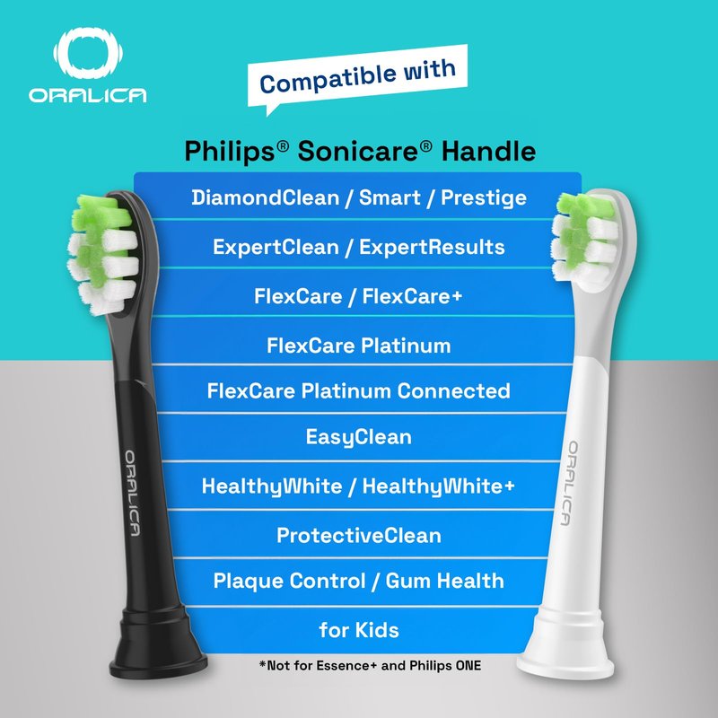 Elevate Your Oral Health with Oralica's Compatible for Philips Sonicare Replacement Toothbrush Heads Experience the perfect blend of functionality and affordability with Oralica's replacement toothbrush heads, designed to fit a variety of Philips Sonicare click-on electric toothbrush handles. Our pack of four brush heads offers a seamless and reliable fit for models including the DiamondClean Prestige 9900, DiamondClean Smart, DiamondClean 9000, DiamondClean series, ExpertResults, ExpertClean, FlexCare Platinum, FlexCare+, FlexCare, ProtectiveClean series, as well as the 4000, 3000, 2000, 1000 Series, and Sonicare for Kids. Each toothbrush head in this pack features advanced 2-in-1 functionality. Medium bristles robustly tackle plaque and stains while the integrated tongue cleaner enhances oral hygiene. The smartly designed, diamond-shaped bristles are dense and precise, targeting hard-to-reach areas and ensuring a thorough cleaning that promotes gum health and brightens your smile. Oralica brush heads are equipped with intelligent indicator bristles that fade in color to let you know when it's time for a replacement—typically every three months—so you can always be confident in the effectiveness of your dental care routine. Affordability doesn't mean you have to compromise on quality. Our replacement heads are crafted to meet exceptional standards, providing a premium clean without the premium price tag. Each head comes with a hygienic cap, maintaining the integrity and cleanliness of your brush between uses. Choose Oralica Compatible with Philips Sonicare Replacement Toothbrush Heads for a superior clean that keeps your teeth healthy and sparkling, all while maintaining your budget. Embrace a fresher, brighter smile today!
