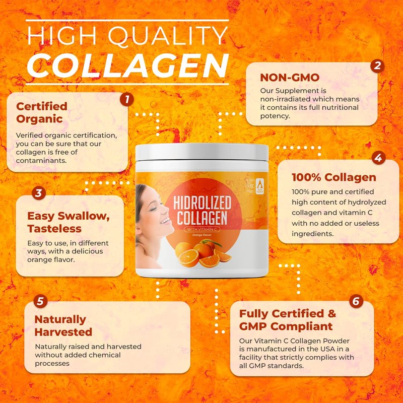 Orange Hydrolyzed Grass Fed Collagen with Vitamin C | Powder Supplement | Non-GMO Verified – 198gr