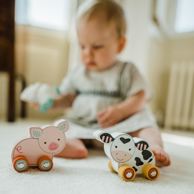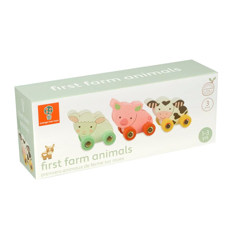 - This beautiful set of wooden toy farm animals on wheels is a great first toy for little hands