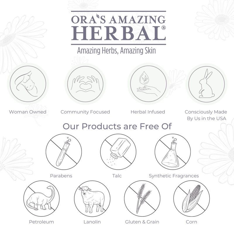 - Cortisone free, Chemical Free, Fragrance free, paraben free, petrolatum free, synthetic free, gluten free and cruelty free. Ora's Amazing Herbal is a woman owned business, we make our products in our own registered facility in the USA.