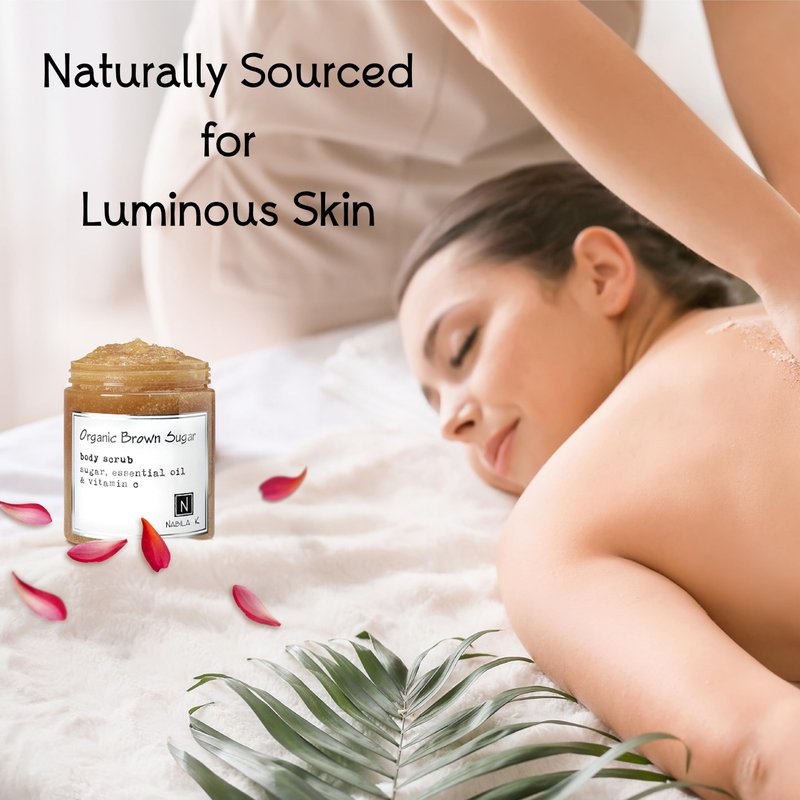 Organic Brown Sugar Body Scrub Made in USA with Essential Oil and Vitamin C by Nabila K - Exfoliate and Moisturize for Smooth Skin - Luxury for Women & Men, 3 oz