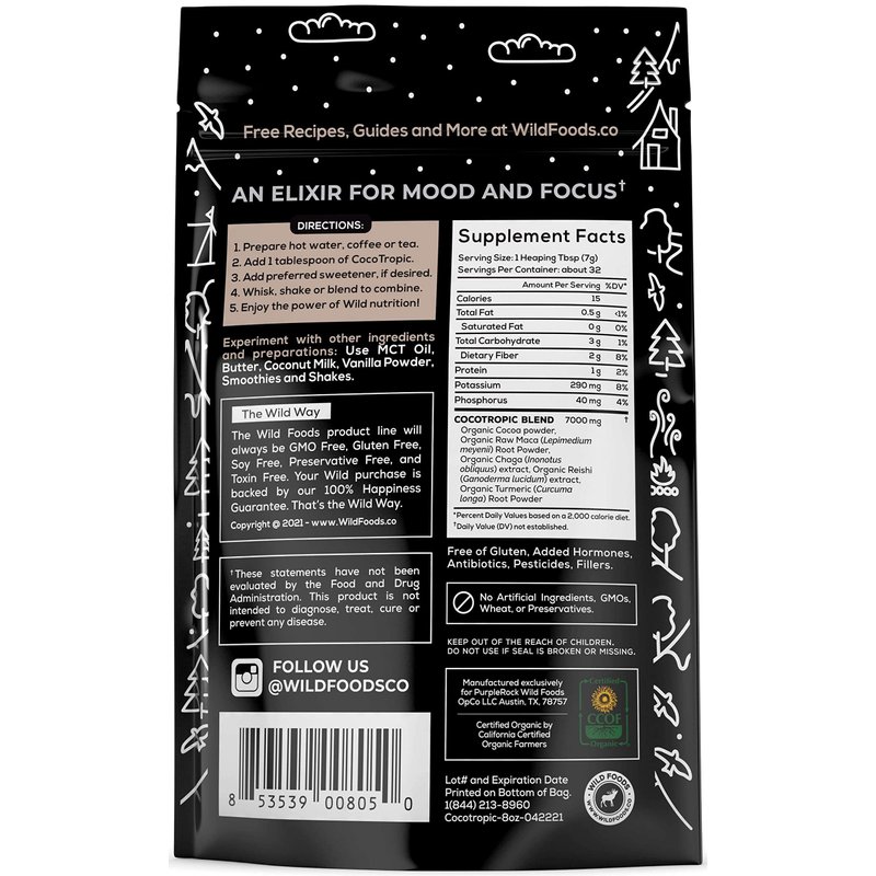 - Benefits: Wild Food's Chocolate mushroom cocoa powder provides sustained energy, is crash-free so you can avoid those afternoon slumps, and doesn’t come with the adrenal issues of coffee. It’s the perfect choice for anyone aiming to enhance their mental performance and health at the same time!