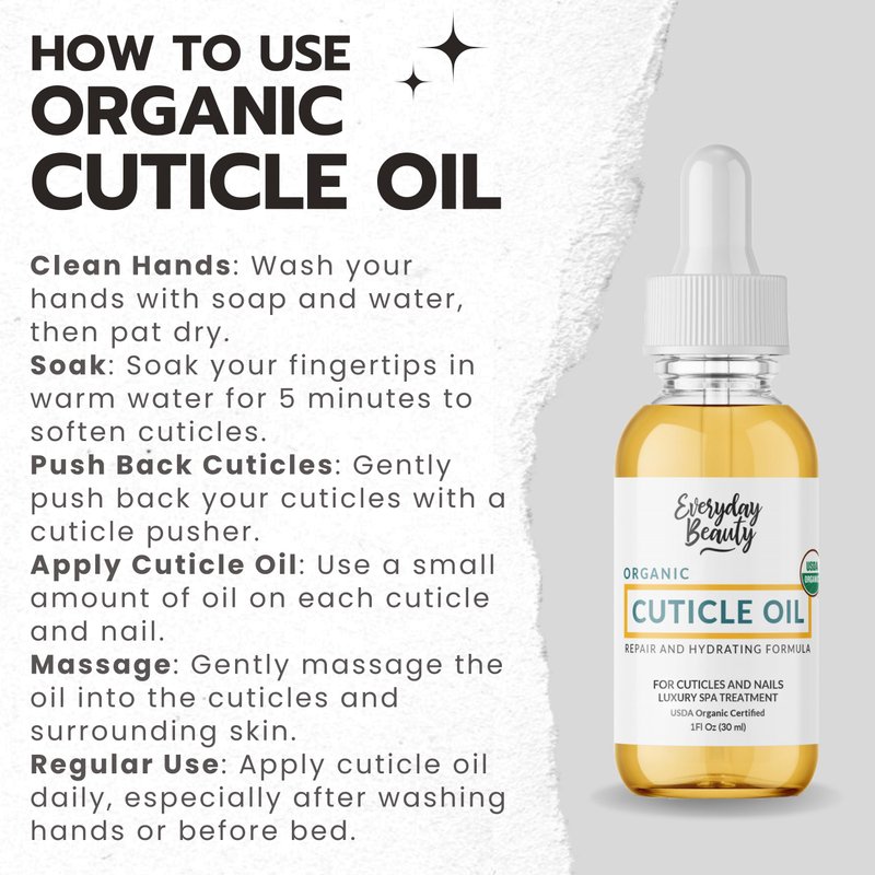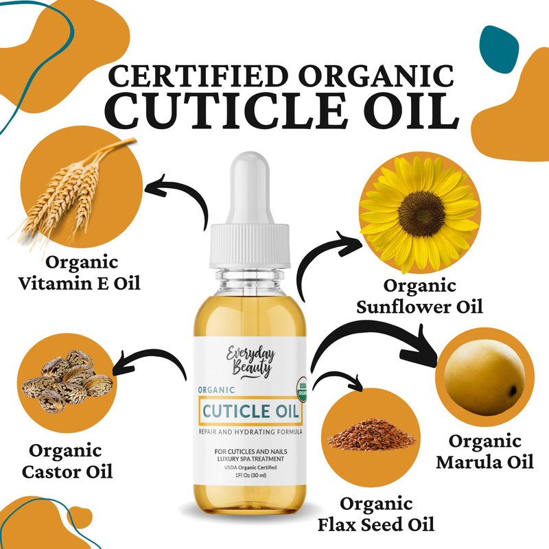 Everyday Beauty USDA Certified Organic Cuticle Oil 1 Fl Oz Glass Bottle with Nail Brush. Only natures finest ingredients were used in our hand crafted cuticle oil. Made with Organic Sunflower Oil, D-Alpha Tocopherol (Vitamin E), Organic Castor Oil, Organic Marula Oil, Organic Flax Seed Oil. Organic Spa Treatment to your door. Certified Organic means no chemicals, Non-GMO, No pesticides, No Chemicals, No Preservatives, No Perfume, No Fragrance, No Dyes. Everything you need in a Nail & Cuticle Oil and nothing you don't. Pamper your hands and revitalize your nails and cuticles. Safe for Gel and Acrylic Nails. Want a Organic Spa Cuticle Treatment at home? just follow these easy steps 1 - Clean and soak hands for 5 min to soften cuticles. 2- Dry hands. 3- Place hand flat on table and carefully push back on gentle cuticles (do not push on or scrape nail) 4- Wash hands, apply Organic Cuticle Oil and you're done! This can be done once a week from home and apply Organic Cuticle Oil daily for healthy cuticles & nails You can simply apply and massage in daily if you get your nails done professionally.