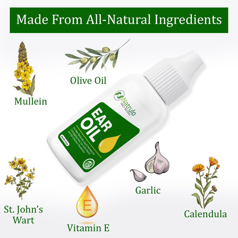 - NATURAL EAR ACHE DROPS: Packed full of natural defense properties, our ear ache oil prevents earaches, & wax buildup. Blend contains mullein, garlic, calendula, vitamin E, Olive Oil, St. John's Wort.
