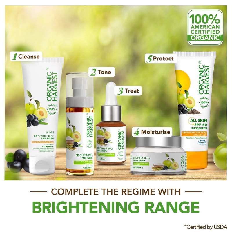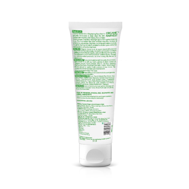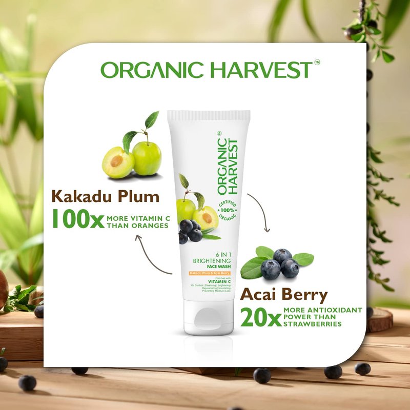 - Brightening Effect: Enriched with Vitamin C sourced from Kakadu Plum, Organic Harvest’s 6-in-1 Brightening Face Wash offers brighter-looking skin. Designed for all skin types including oily skin, this organic face wash ensures the removal of dead skin cells, revealing glowing & revitalised skin.