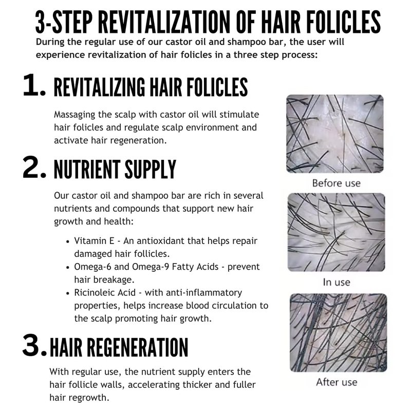 - ๐ฟ Organic Alchemy: Crafted with certified organic ingredients. Our castor oil and shampoo bar are rich in several nutrients and compounds that support new hair growth and health (Vitamin E, Omega-6 and Omega-9 Fatty Acids, Ricinoleic Acid, et.c). Perfect for those experiencing hair loss/alopecia.
