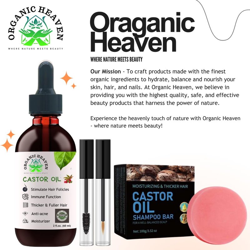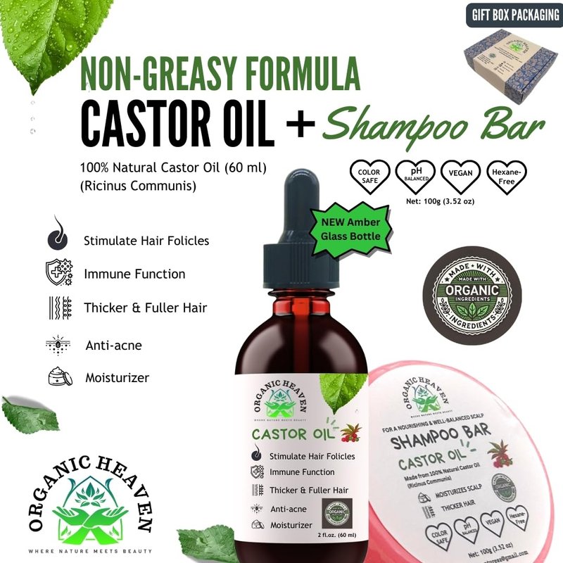 Crafted with the finest organic ingredients, the castor oil and the shampoo bar (formulated with castor oil) to nourish and hydrate skin, hair, and nails. Formulated to be non-greasy, comes in with a leak-free amber glass bottle with a dripper for easy application. This advanced formulation glides on effortlessly, providing deep nourishment and hydration to your hair, skin, and nails without leaving a heavy residue. Perfectly balances the pH in your hair to keep it soft, shiny, and strong. Whether you're looking to stimulate hair follicles, promote healthy and fuller hair, moisturize your skin, or boost your immune functionality, our castor oil offers a luxurious and effective solution that integrates seamlessly into your beauty routine. Our castor oil and shampoo bar are rich in several nutrients and compounds that support new hair growth and health. Perfect for those suffering from hairloss/Areata Alopecia. Amazing results in six months of regular use. Experience the heavenly touch of nature with Organic Heaven. At Organic Heaven we believe in providing you with the highest quality, safe, and effective beauty products that harness the power of nature. Visit our website to learn more about our products - www.organicheavens.com